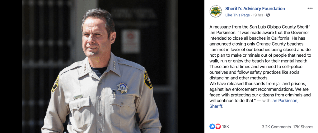 In a Facebook post on the Sheriff’s Advisory Foundation page, San Luis Obispo County Sheriff Ian Parkinson issued a statement saying HE WILL NOT be enforcing these unjustified beach closures. Later on in the post he brought up the many criminals that are being released because of the Wuhan Virus despite protests from law enforcement.