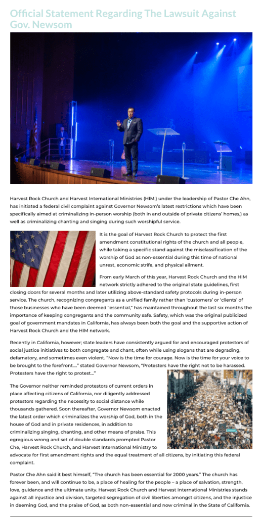 “For over nine months, the Governor has continued to discriminate against Churches’ religious worship services while permitting myriad nonreligious entities to continue to gather without numerical restrictions inside the same house of worship and in other external comparable congregate assemblies,” the church said in its filing, referring to essential businesses and services that are permitted to operate.
